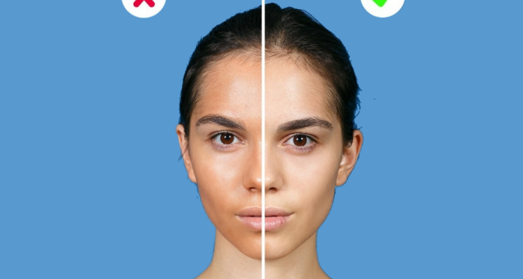 Kozmetiksiz (solda) ve profesyonel bir makyaj sanatçısı tarafından sadece yüz hatlarına kozmetik uygulanmış bir katılımcı (sağda)